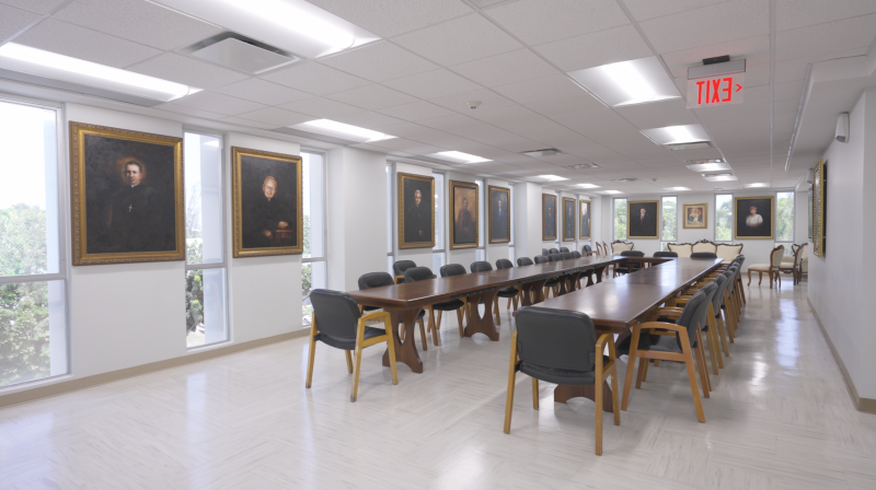 Justo en el cuarto piso del icónico edificio Los Fundadores del recinto central de Ponce de la Pontificia Universidad Católica de Puerto Rico, una renovada sala será testigo de las más importantes decisiones institucionales. Se trata de la ahora Sala de Juntas, un moderno espacio que reunirá al liderato de la Institución. En una atmósfera cálida y llena de arte, la Sala expone pinturas que cuentan la historia de La Católica. A través de los cuadros de los obispos que fundaron La Católica y de los pasados rectores y presidentes de la Institución, se honra la visión y la gesta de estas importantes figuras que comenzaron y continuaron la misión y la visión de la hoy Pontificia Universidad Católica de Puerto Rico.
