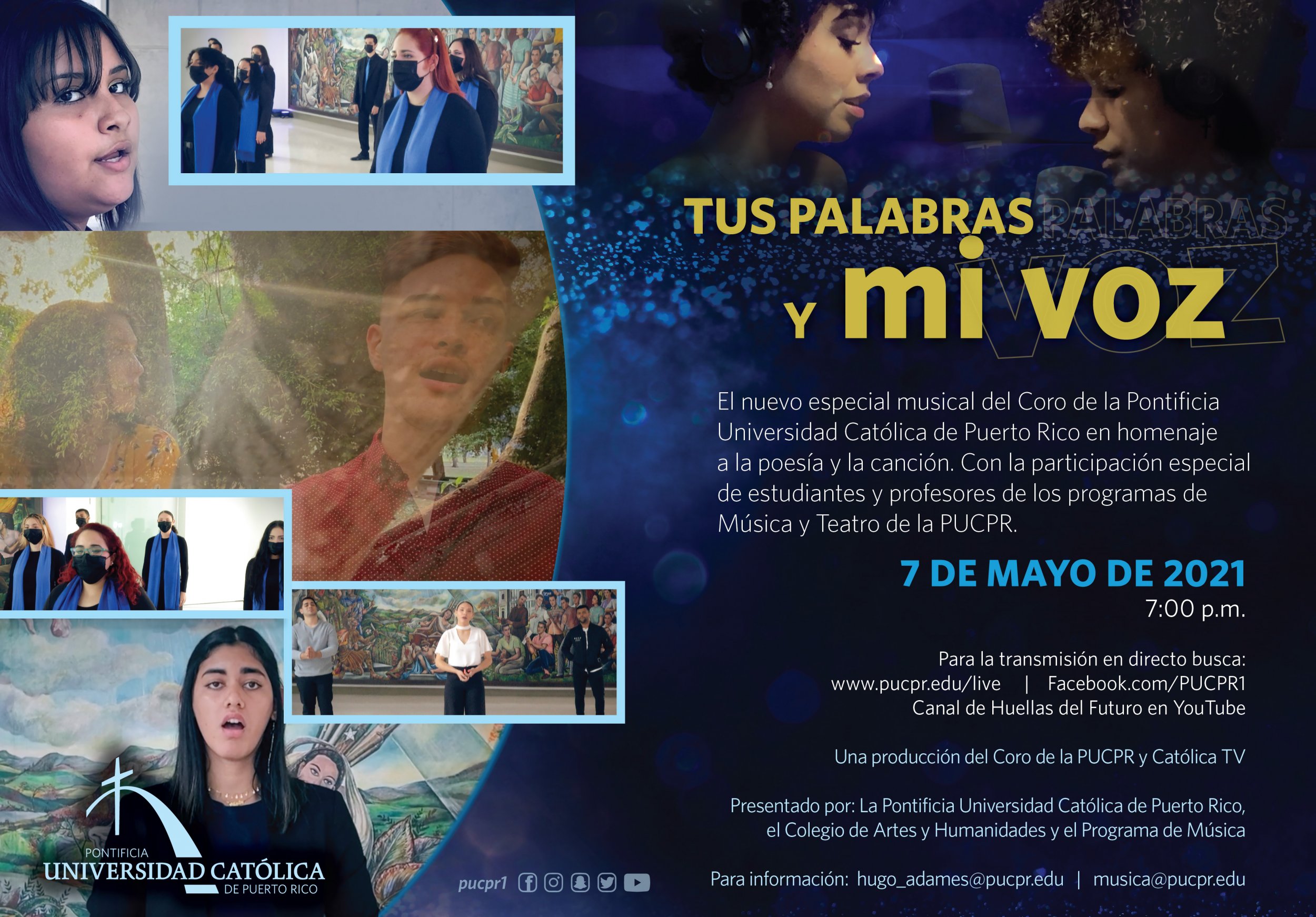 Tus palabras y mi voz By celimer_torres@pucpr.edu | April 30, 2021 El Coro de la PUCPR presenta su especial musical en homenaje a la poesía y la canción Posted in General ← Magistral encuentro con el maestro Danny Rivera y Hermelindo Ruiz¿Restricciones civiles y derechos humanos durante la pandemia? →