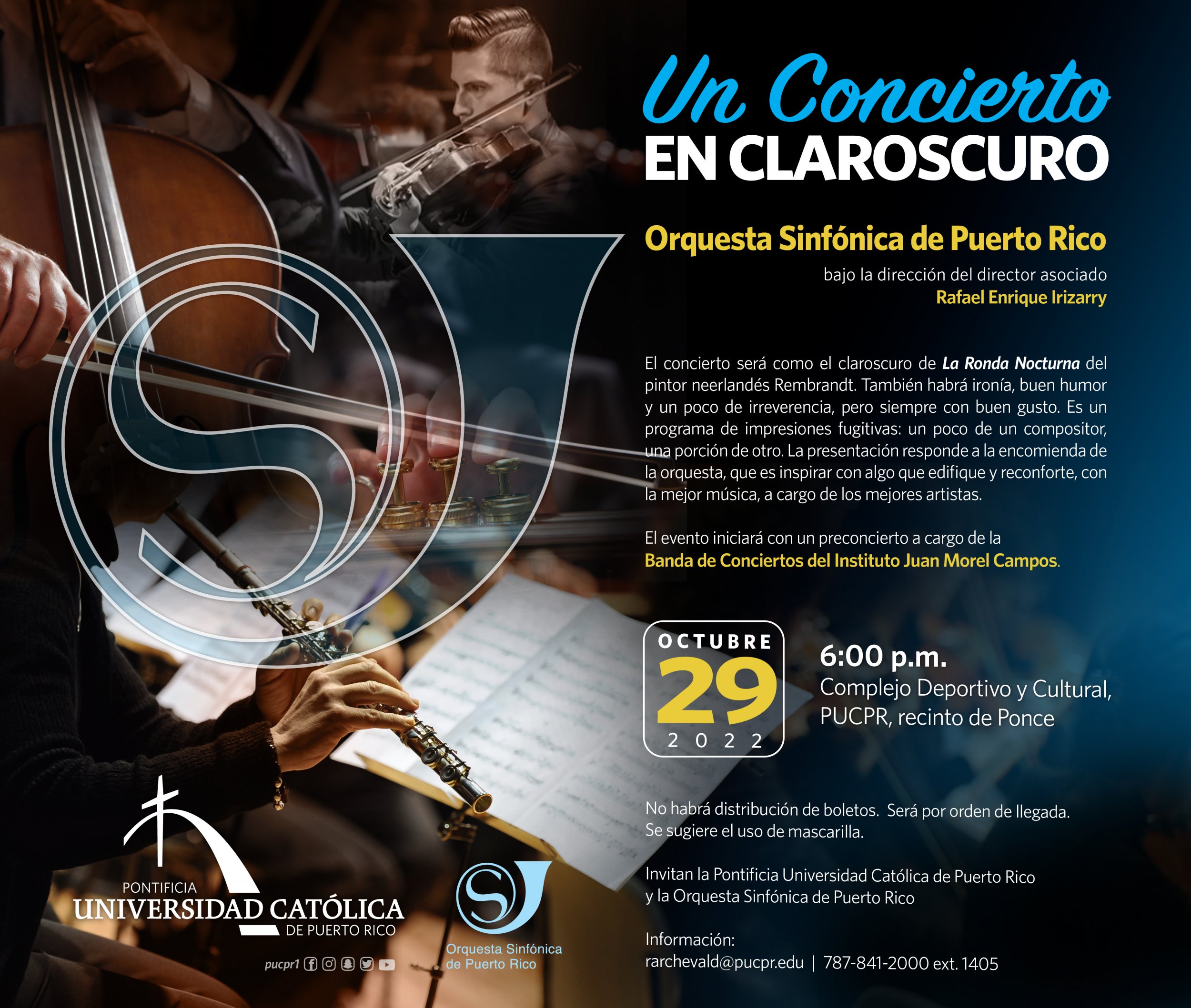Un Concierto en Claroscuro By celimer_torres@pucpr.edu | October 21, 2022 El evento está a cargo de la Orquesta Sinfónica de Puerto Rico bajo la dirección de Rafael Enrique Irizarry. Posted in General ← La libertad de expresión y la investigación periodísticaEducación: Base del Desarrollo →