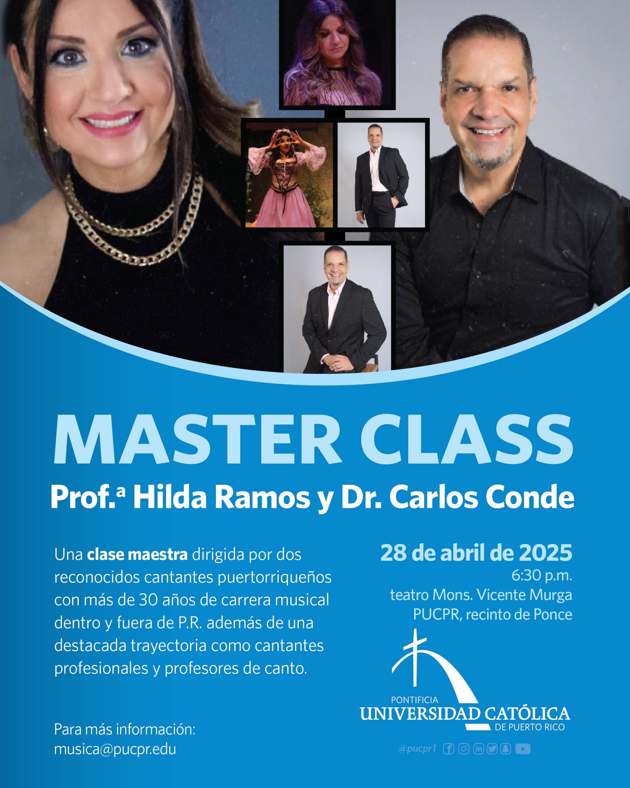 ¡Una oportunidad única para aprender de los grandes! By celimer_torres@pucpr.edu | April 10, 2025 Participa de la clase magistral a cargo de la soprano Prof.ª Hilda Ramos y el tenor Dr. Carlos Conde Posted in General ← ¡La magia de la música cobra vida en manos de nuestros estudiantes!¿Buscas empleo? →