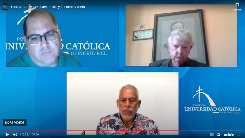 Durante el conversatorio Las costas: entre el desarrollo y la conservación, el Instituto de la Doctrina Social de la Iglesia de la PUCPR invitó a dos expertos en el tema. “Los ecosistemas costeros son muy importantes para nuestro bienestar. Proveen, además de solaz y esparcimiento, protección contra la erosión marina y zonas de crianza de peces y mariscos para nuestro sustento. Lamentablemente, esos ecosistemas están amenazados por el cambio climático y la acción humana. Sin embargo, existen alternativas que nos permiten balancear el desarrollo y la conservación de dichos ecosistemas”, expresó el director del Instituto, Lcdo. Israel Santiago.