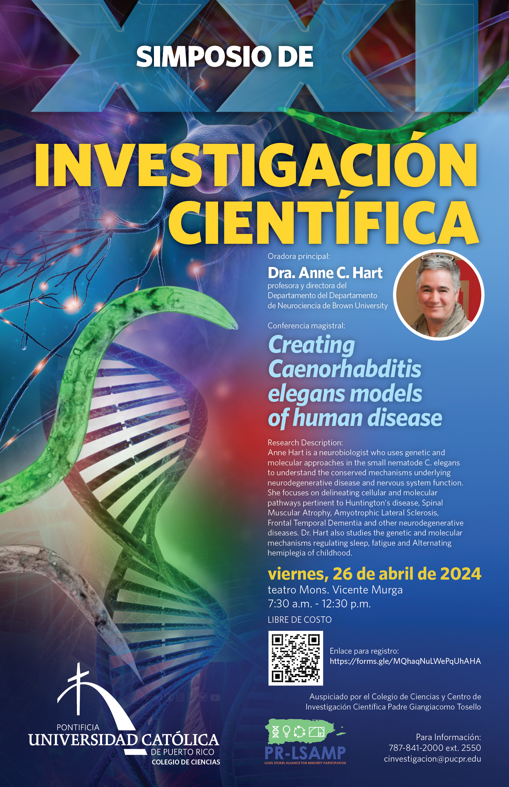 XXI Simposio de Investigación Científica By celimer_torres@pucpr.edu | March 20, 2024 La oradora principal, Dra. Anne Hart, dictará la ponencia Creating Caenorhabditis elegans models of human disease Posted in General ← Conferencia: Educación en ciudadanía global y propósitos educativos audacesRosado: fidelidad y espíritu de servicio a su amada Universidad →